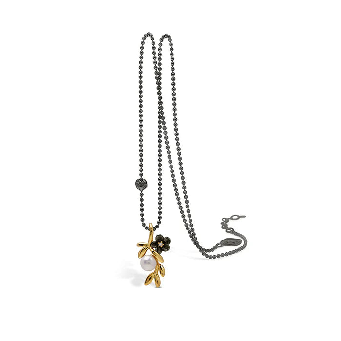 Beskrivelse: Nydelig halsbånd med perle og liten oksidert blomst og forgylte blad