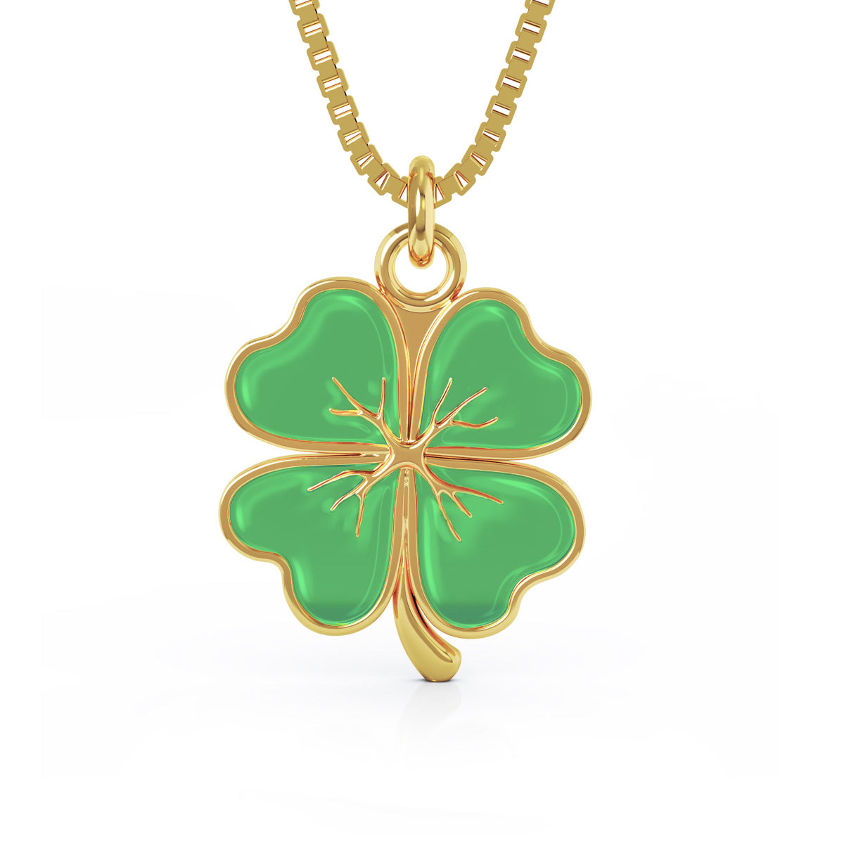 Beskrivelse: Et vakkert smykke i grønn emalje med motiv av firkløver