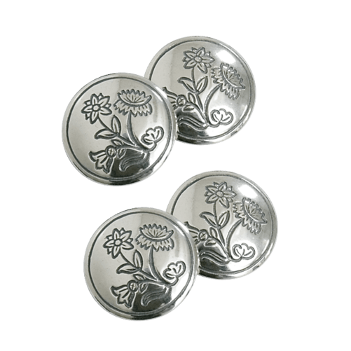 Beskrivelse: Doble mansjettknapper til Nordlandsbunaden i oksidert sølv. Blomstermotivet tar utgangspunkt i motivet i selve bunaden